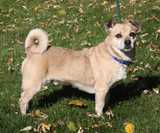 Odie looks like a "Chug" -- Pug/Chihuahua mix, about 1-2 years old and 15 lbs. He is a sweet little boy with big brown eyes and a curled up tail. He is friendly with people but prefers to be an only dog. Thank you Arthur Kern for sponsoring my vet care!