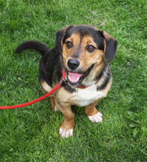 Otis, a beagle basset mix, is an incredibly sweet and loving guy. He was abused as a pup and has a slightly deformed left leg that doesn't slow him down at all. With his short legs he flies up and down the steps and through the park. He keeps up with the leggier dogs and loves to chase a ball. He is great at the dog park, totally housebroken, loves car rides and will do anything for a treat! He is a bit shy and cautious when first meeting people and has a huge bark for a little dog when someone comes to the door- but it is all for show. He sleeps with his foster parents and the 3 other larger dogs in the home (it is a very crowded bed) and stays by their sides in and out of the house. His is about 6 or 7 years old. He is neutered and up to date on all of his shots. Because of his timid nature he would do better in a calmer home.