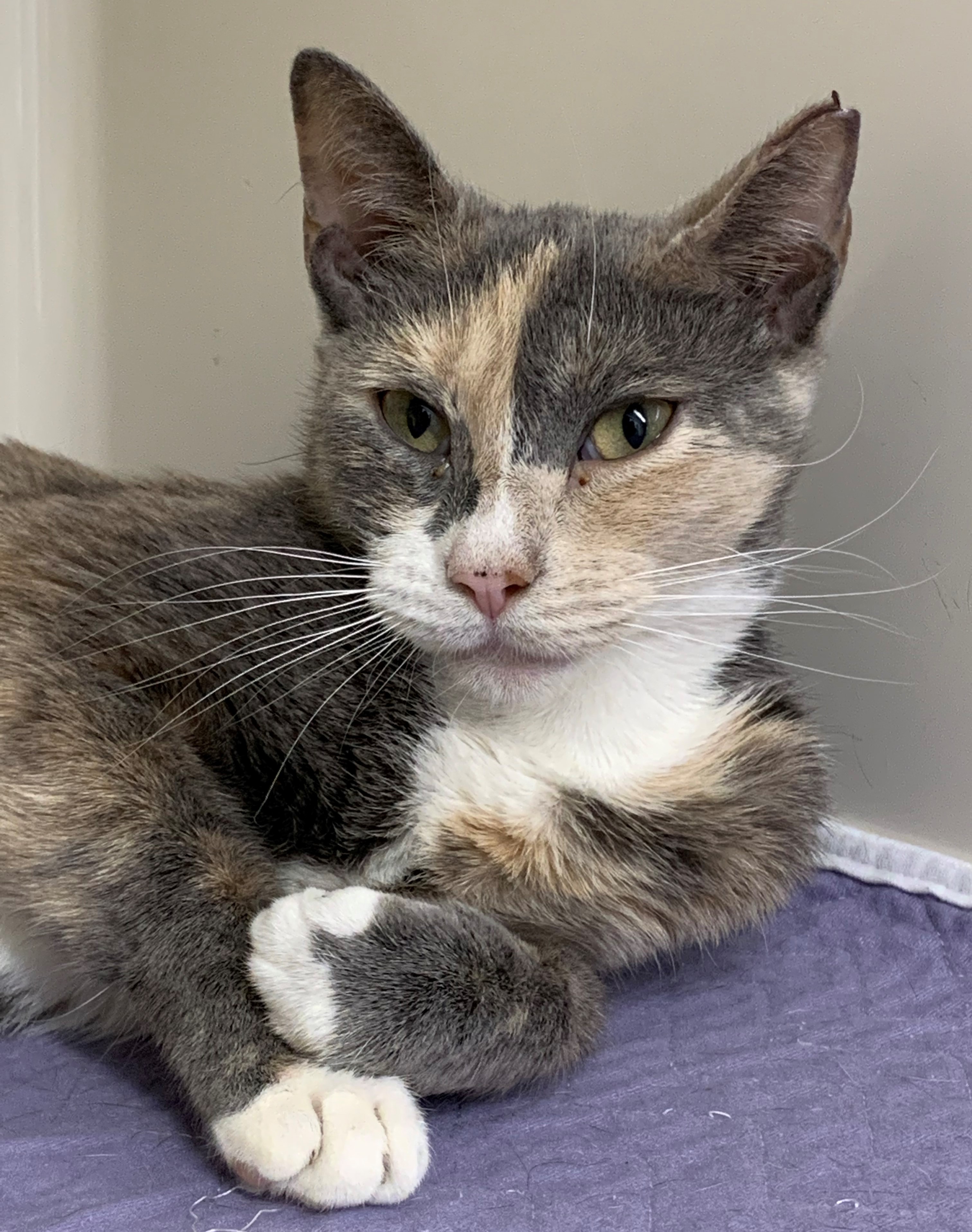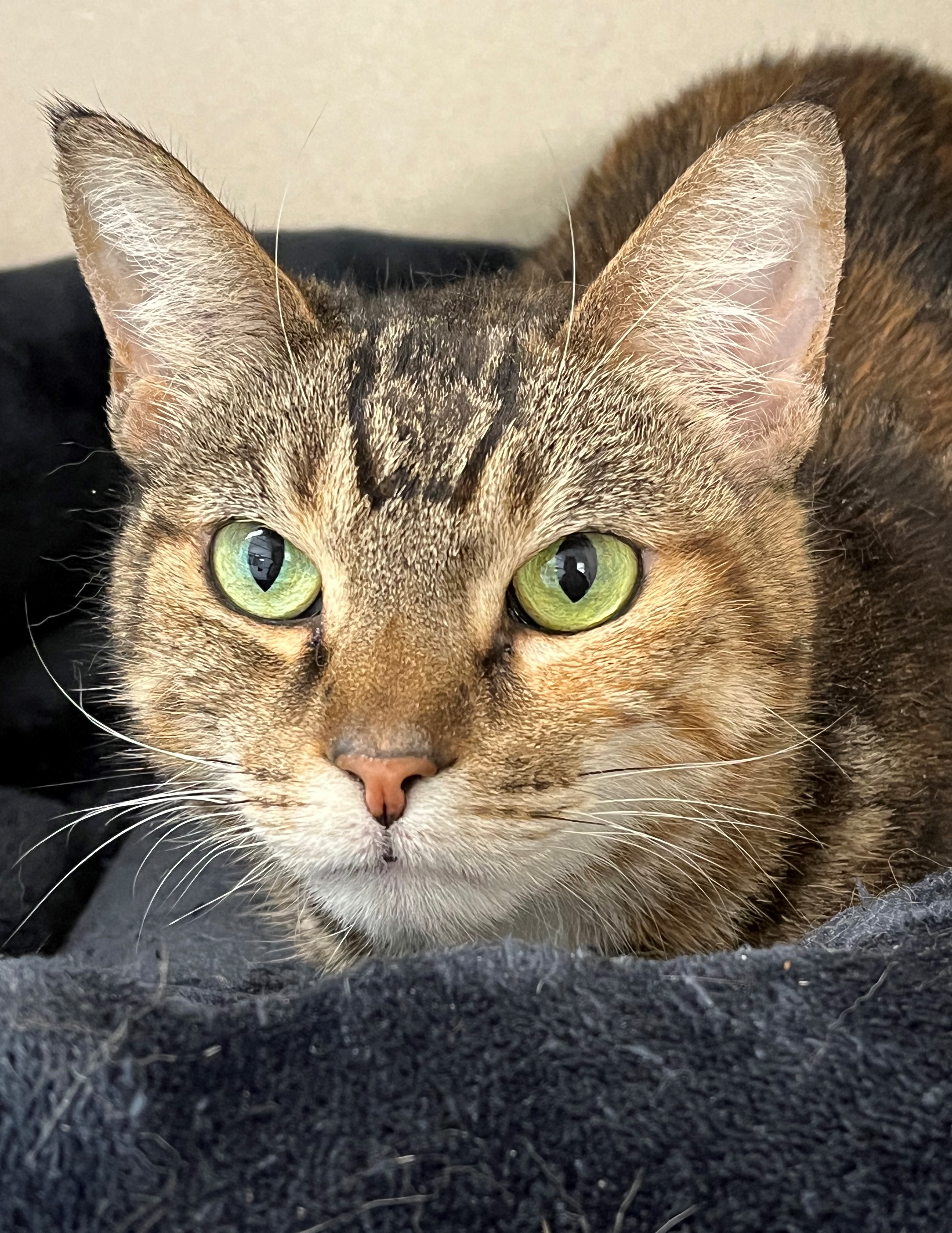 Portia is as lovely and unique as her name. This 2 year old Torby with her distinctive mix of tabby and calico markings is as sweet, charming and friendly as she is beautiful. She will look at you with her amazing eyes and you will fall in love. Portia gets along with other cats and should do well in a family setting.