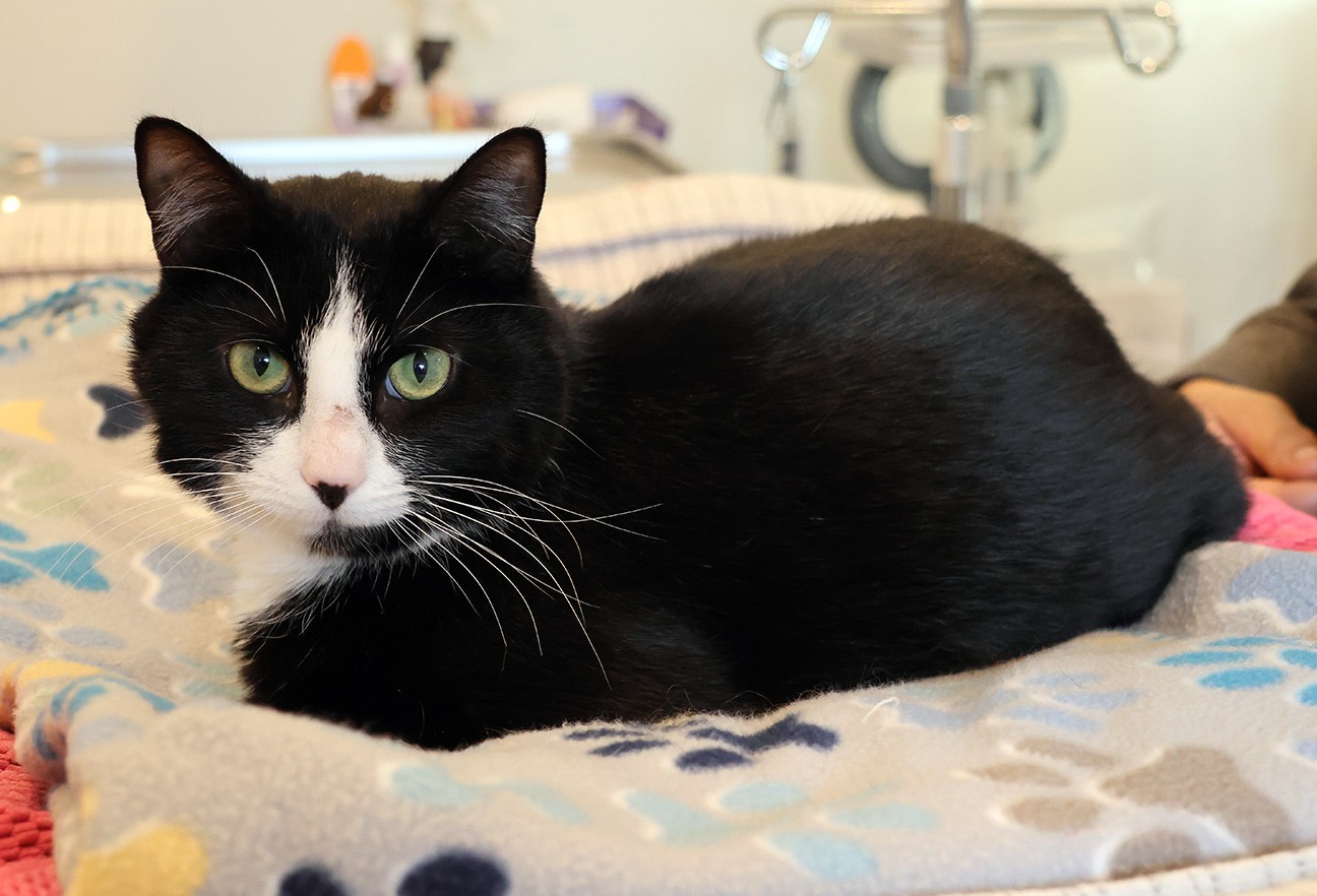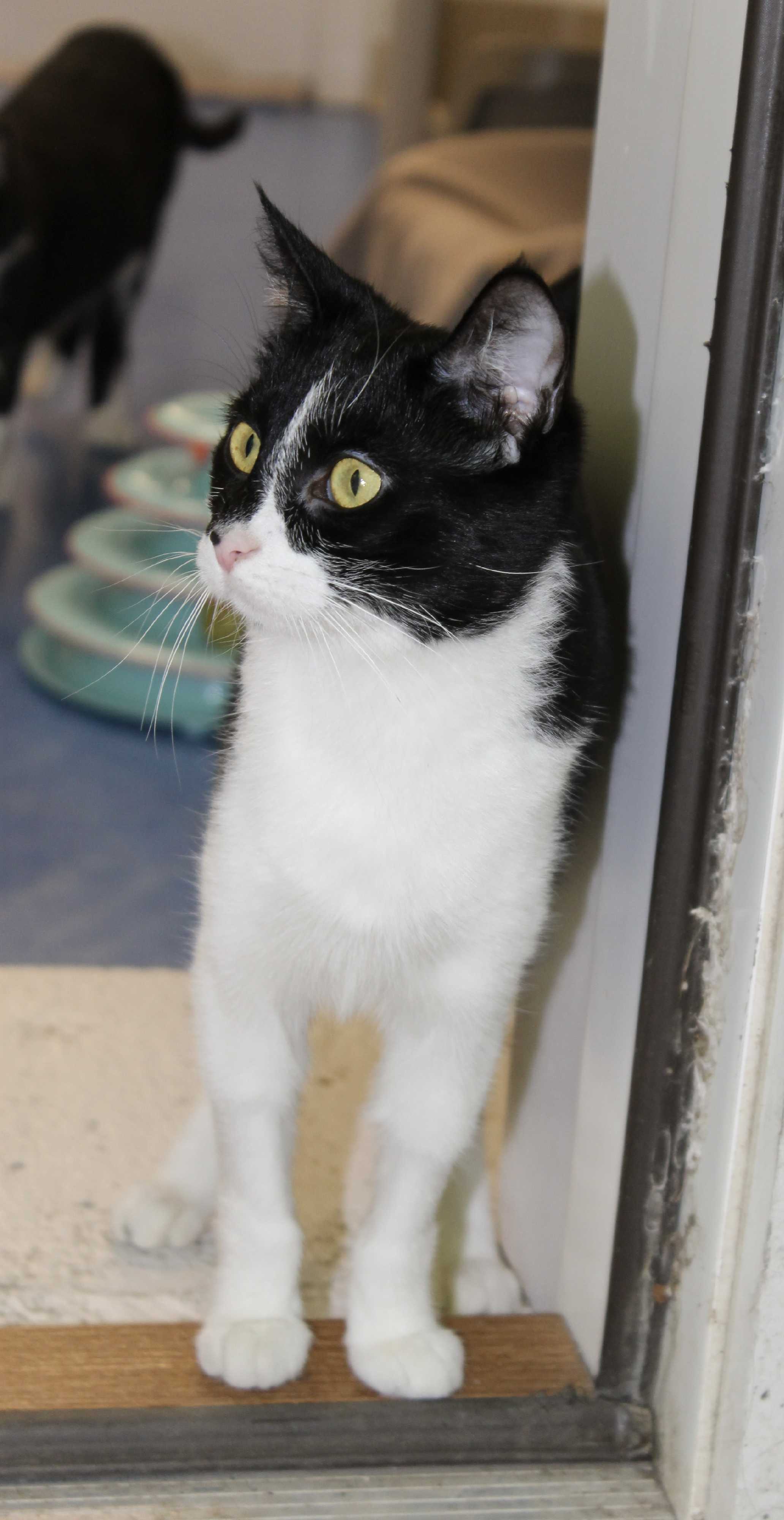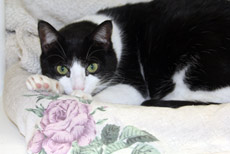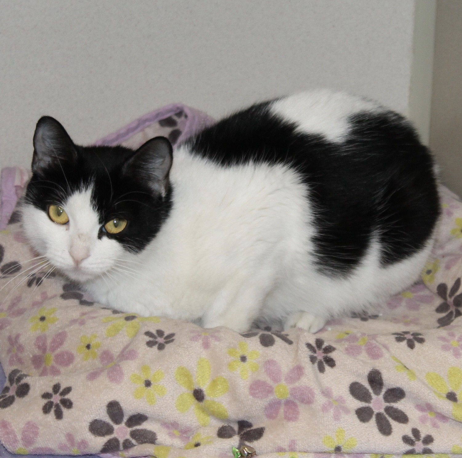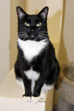 Patty (born in 2008) is a beautiful tuxedo. This sweet, quiet girl was given up by someone who moved into a home that did not allow cats. She is friendly with all and is comfortable with other cats. Patty can be visited at the Kitty Cottage.