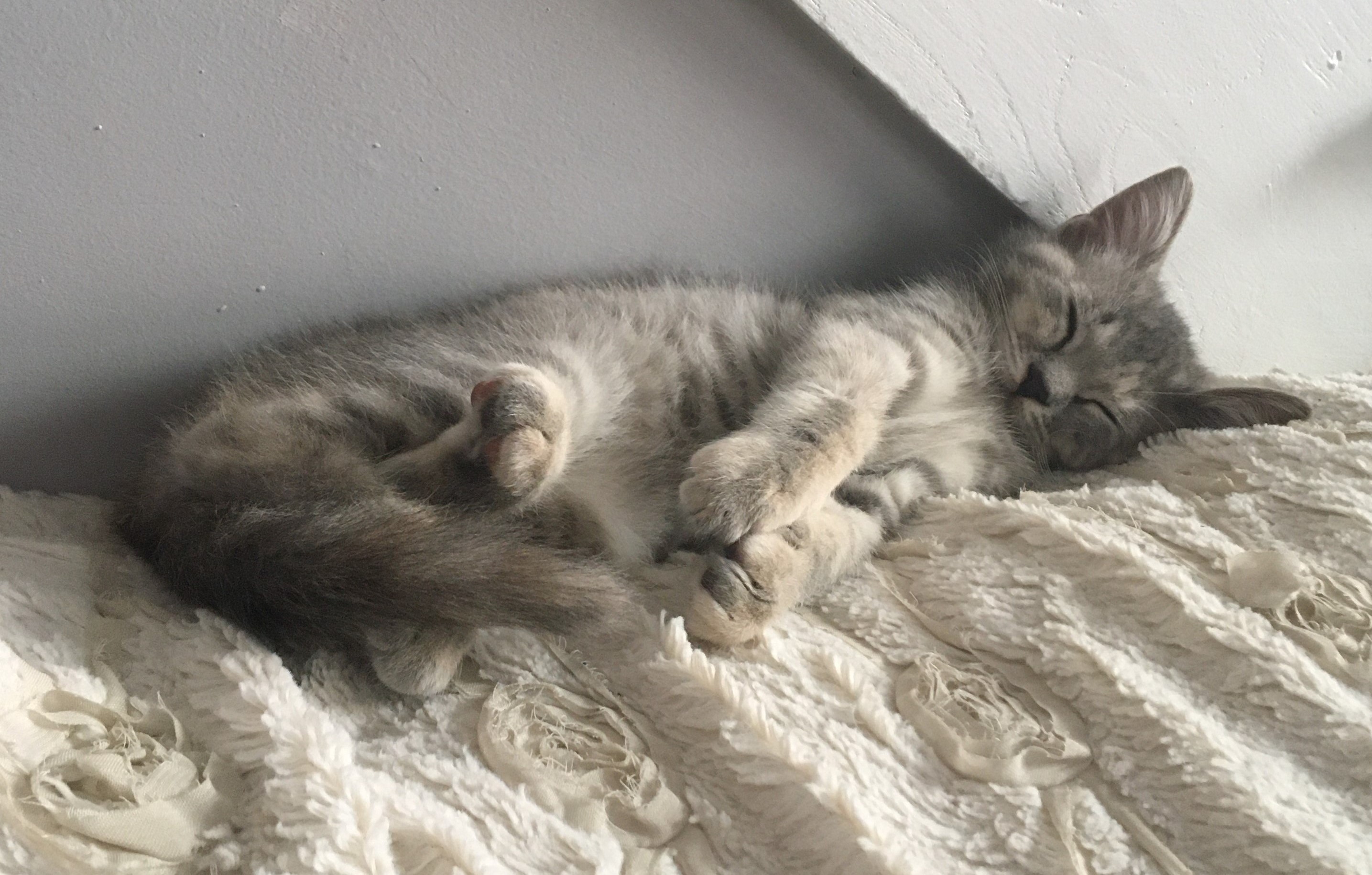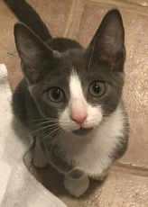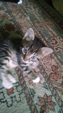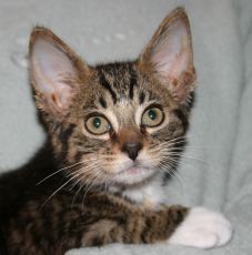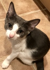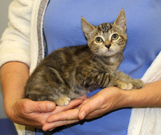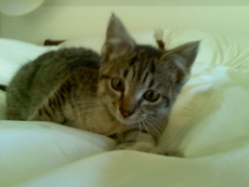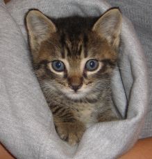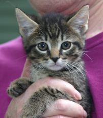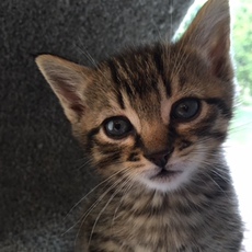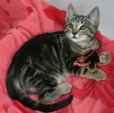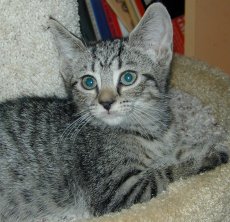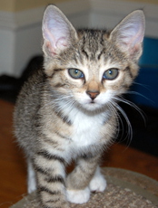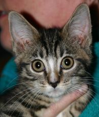 An adorable grey tabby kitten, about 8 weeks old. Sweet, playful and friendly.