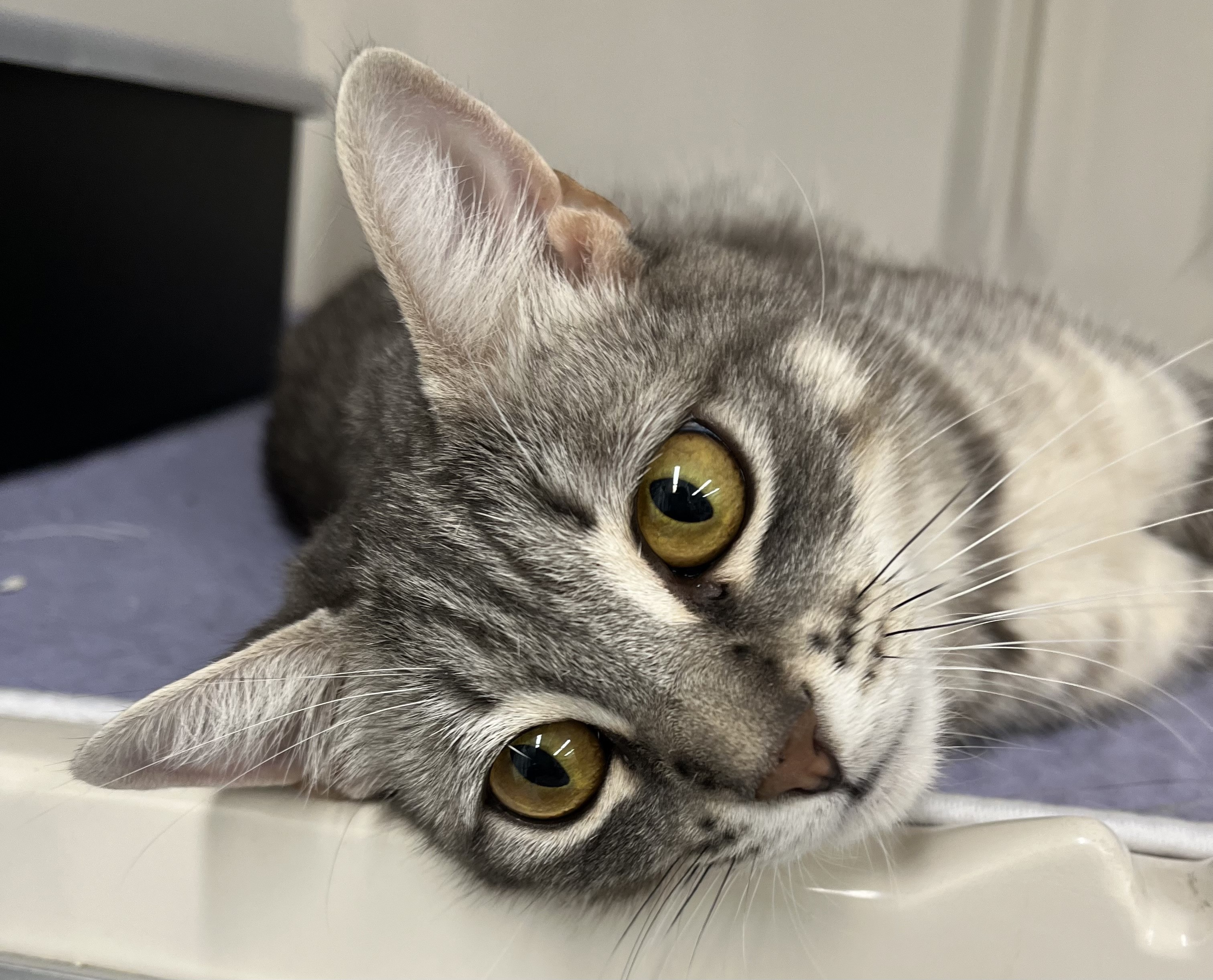 Born July 2023 Padme is a petite tabby with lovely coloring. She has a gentle nature and is very comfortable around humans of all ages. Padme loves to play and can entertain herself with a variety of small toys. Of course, if you have the time, she's happy to chase anything you send her way. Padme will invite you to pet her with a quick roll to the side and a chin up for scratches. She's not a talker but a little head nudge will let you know she's looking for your time and attention.