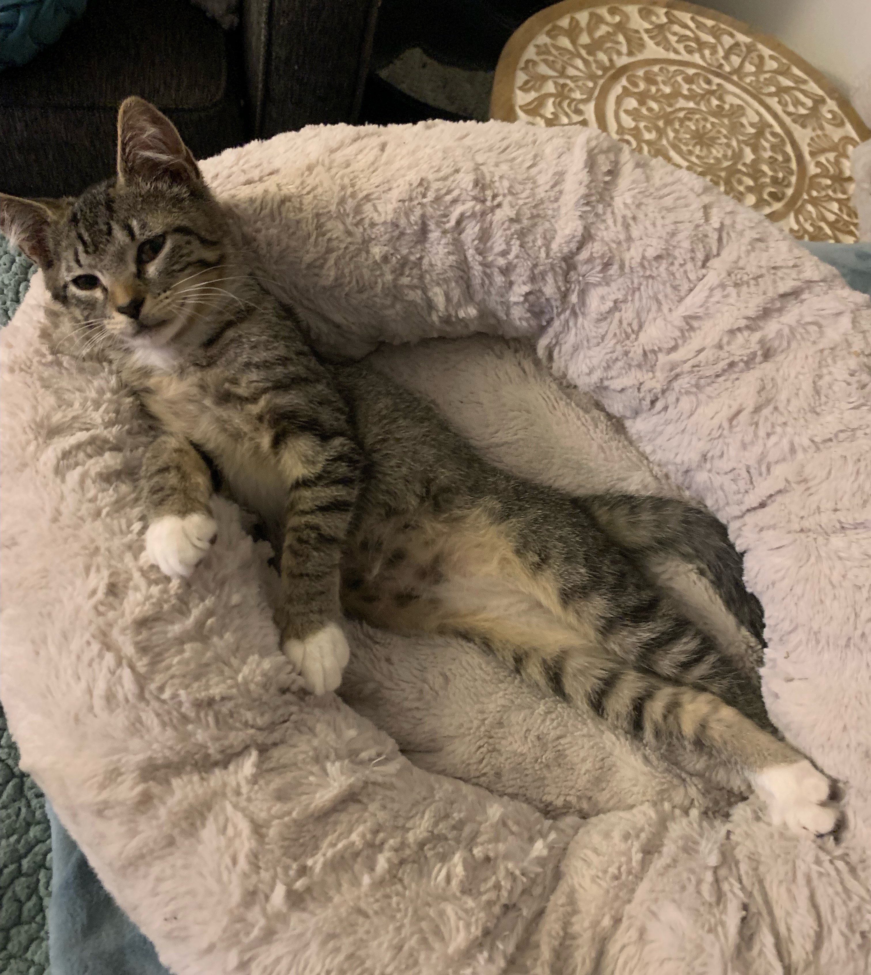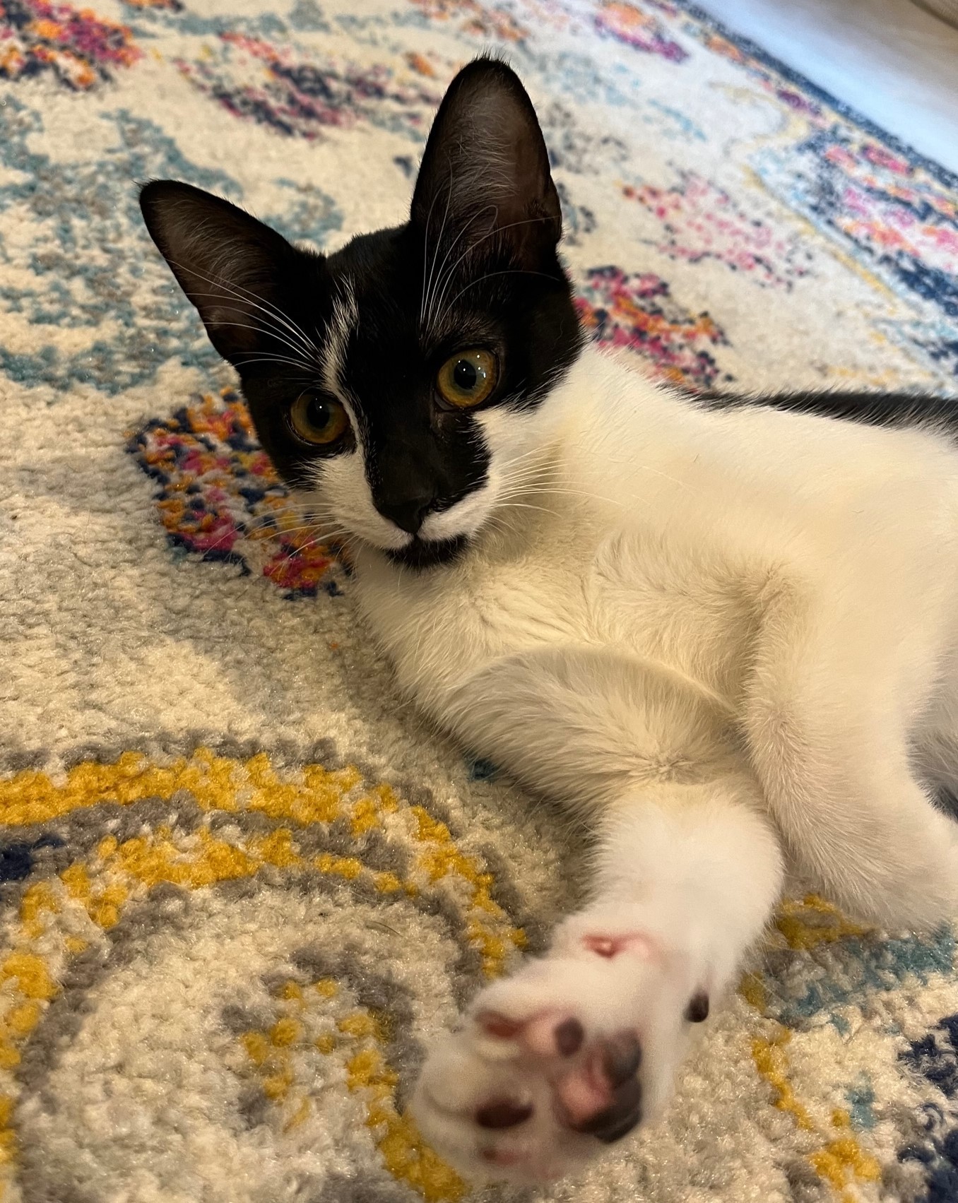 Born July 2023 This petite young girl is friendly and playful. She often winds around legs to get attention. Patty is quick to purr and rollover to get her chin scratched. She likes to catch whatever is attached to the end of a wand toy and will happily walk away with her prize if you let her. When the day is done Patty is content to curl up on any soft spot available. No dogs please.