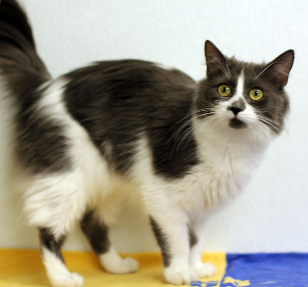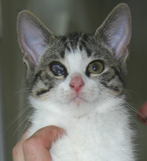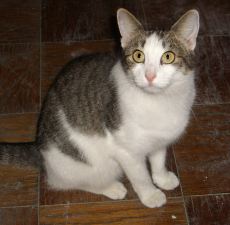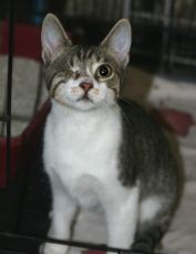 is a beautiful gray/white kitty, about 3 years old. She was found wandering the streets with a bad eye, which needed to be removed. She only has one eye, but she sees everything. She loves people and other cats. Loves to hug and play too.