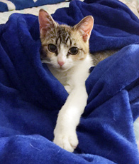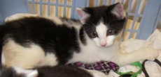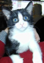 all kitten, was raised in a home with her family and other cats. She is a very alert, comfortable, and loving baby with an unusual coat, longish black and white holstein markings. Pammy is as friendly with everyone as her mother, a young tabby who will be up for adoption after spaying.
