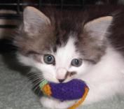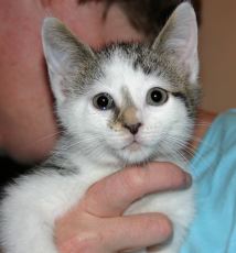 is a very sensitive kitten. He loves to play, but is scared of new things. He is about 8 weeks old and the largest of the litter. Has an adorable patch on his nose.