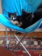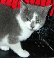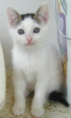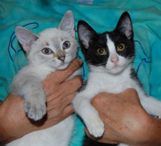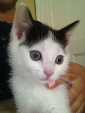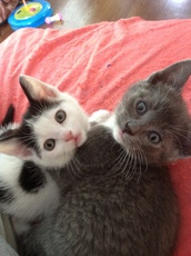 Poppy (white kitten with some black spots) and Flora (grey with some white) are two adorable kittens, born mid-April 2012. The two sisters are as sweet as can be. They love to play and wrestle and are so much fun to watch. You just won't want to take your eyes away from this darling duo, who love to curl up in your arms. We hope to adopt these two together as they love each other so much. To see photos of Flora, just click on "photos". To meet these two kitties, contact Gwen at gwenbuch@gmail.com