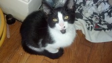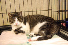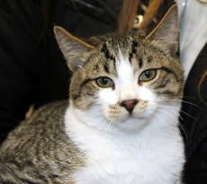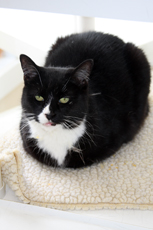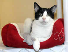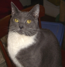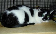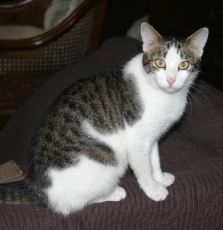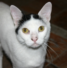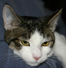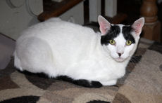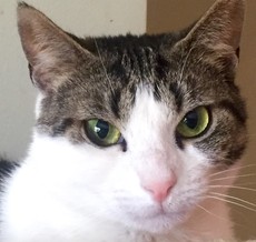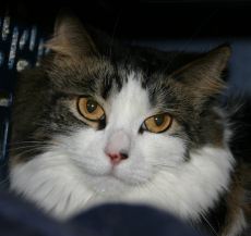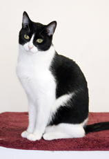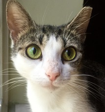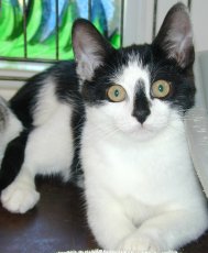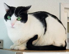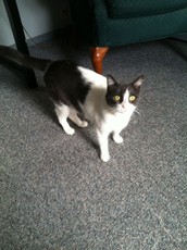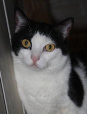A charmer, her beautiful eyes mesmerize and she loves to sit and watch as if she is trying to learn your business. Her coat is smooth and crisply divided into black and white as if carefully designed. Patty loves to have her back rubbed. She will nuzzle against you and purr non-stop . When her owner died she was put out on the street in Mt. Vernon. Now she is longing for a home of her own. If you have other pets, that will be fine with her.