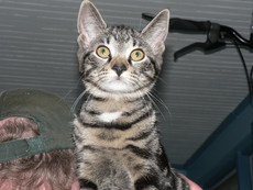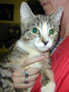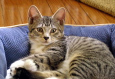 Priscilla is a petite miss who loves affection. This very pretty tabby is happy to sit on your lap to be cuddled and kissed. She also enjoys a rousing game of "chase the toy mouse" and racing with her litter mates. She gets along well with other cats and isn't sure yet if dogs are useful. Priscilla was born in early May, along with her litter mates (Chuckie & Chip).