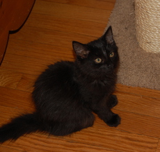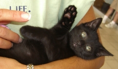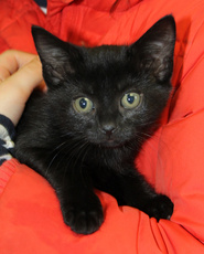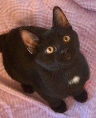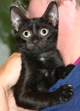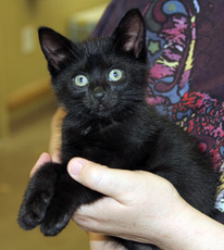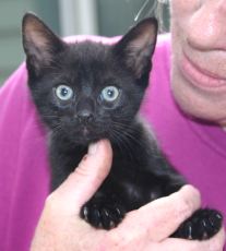 Priscilla is a sweet little 7-8 week old kitten (born late July) with a smooth black coat that just glistens. This little bundle of fur and fun resides in a foster home where she is with other cats, dogs and children.