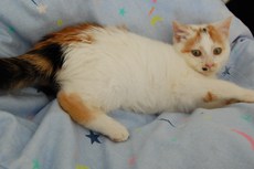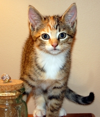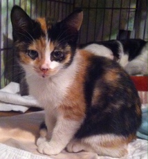 Patches is a 4.5 month old (born approx.end of February 2015) very high energy calico kitten. She purrs and enjoys kissing her human, and has learned to get along with the other cats and dogs in her foster home. We feel it best if Patches goes to a home where there is already another kitty who would enjoy having her as a playmate.