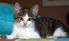 4 adorable kittens, about 12 weeks old. They are all very sweet and friendly. They love to play and then find a lap to curl up and sleep on. They are living in a foster home with cats, a dog and kids and they love them all! The mostly white kitten with light tabby is about 15 weeks old and is not Patricia's biological kitten but she doesn't know that.