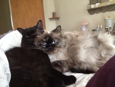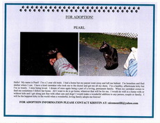After being cared for in a city apartment, Patricia and her daughter Pam were moved from the city with their family only to be abandoned to the street. At first, they were given their food outside and then they were not allowed in doors at all. After that, their family stopped feeding them altogether but an elderly woman in the neighborhood noticed the helpless pair and began to take over their care, feeding them and giving them shelter. She is trying her best but feels she is not up to the job and would like to see them in a caring home with younger people. The mother is quiet but willing to make friends, winds around your legs and appreciates being brushed. The daughter is playful and lively.