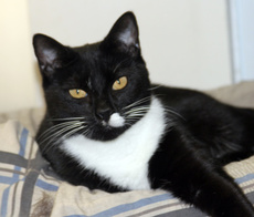 Pam is a beautiful tuxedo, very sweet and friendly. To meet her is to love her! She is petite, silky and adorable with the cute little white spot on her nose. Pam gets along well with children, including ones as young as 4. She would be an excellent choice for a family.