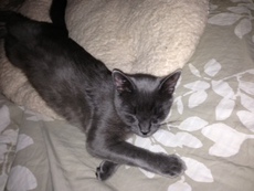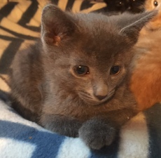 Poupon is one of Fiona's kittens and she had a litter of five, born near Montefiore Hospital in the Bronx and rescued by a nurse who works there. All are 9 weeks old (as of 5-5-15), energetic and cute as can be. Little Poupon is the one all grey among this adorable litter. Perhaps he has some Russian Blue in his ancestry.