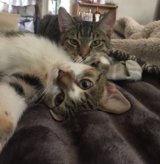 These sweet babies are very attached to each other and literally hug each other. They are sweet, playful and very affectionate. We would like to find them a home together. They are about 9 weeks old, tested neg for FIV/FelV and have age appropriate vaccines.