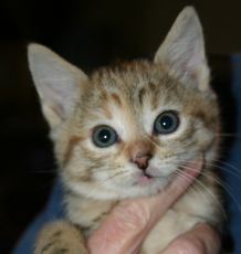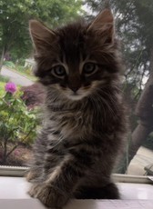 One of Pamela's kittens, Pocahontas is almost a twin to Phoebe and Petunia. She's inquisitive and very sweet. She adores grabbing toys from her sisters and then playing hide and seek. Gentle, a little shy, but extremely sociable once she knows you. Born the end of May (9 weeks old now), she is micro chipped and ready for her loving forever home.