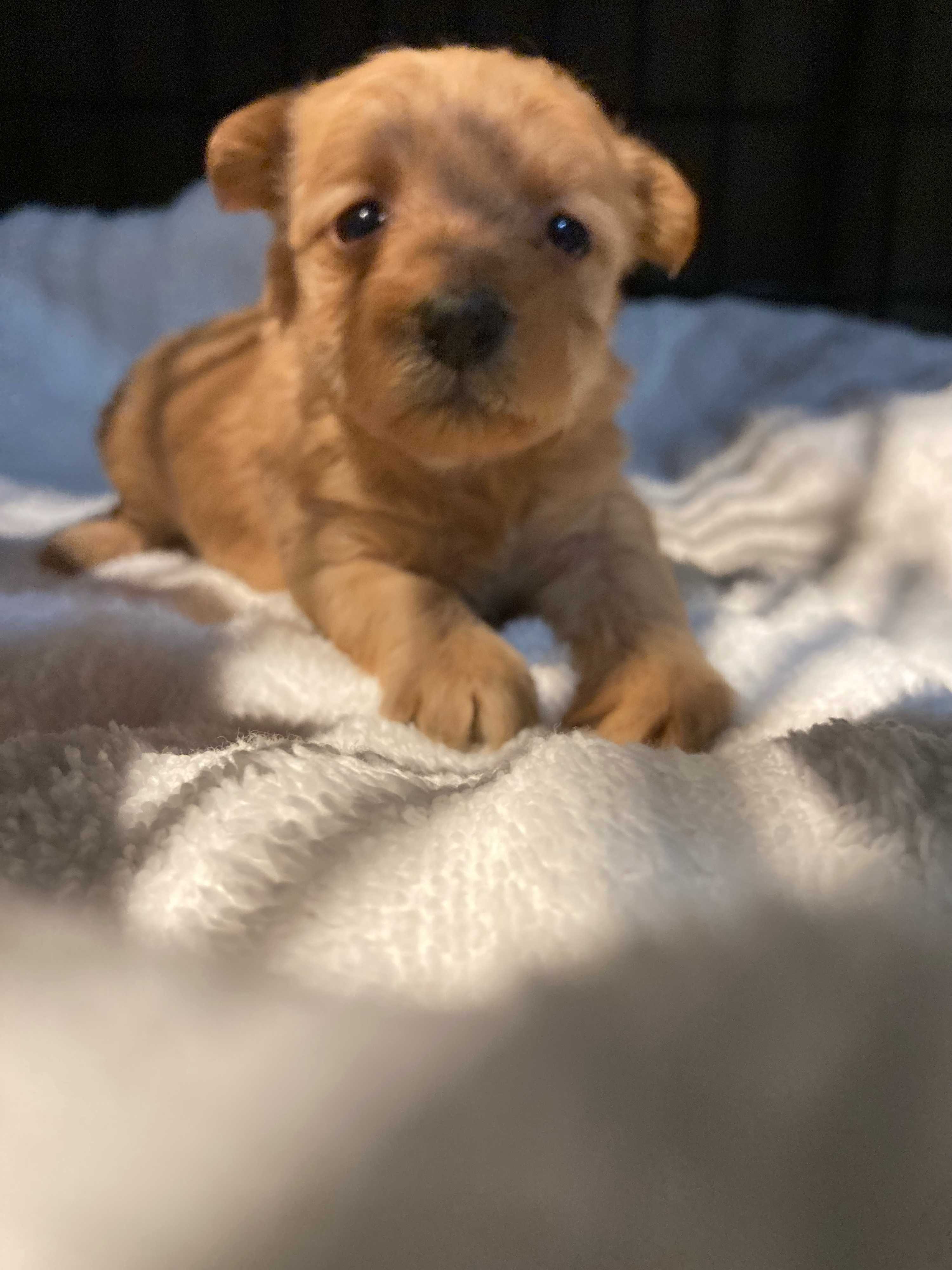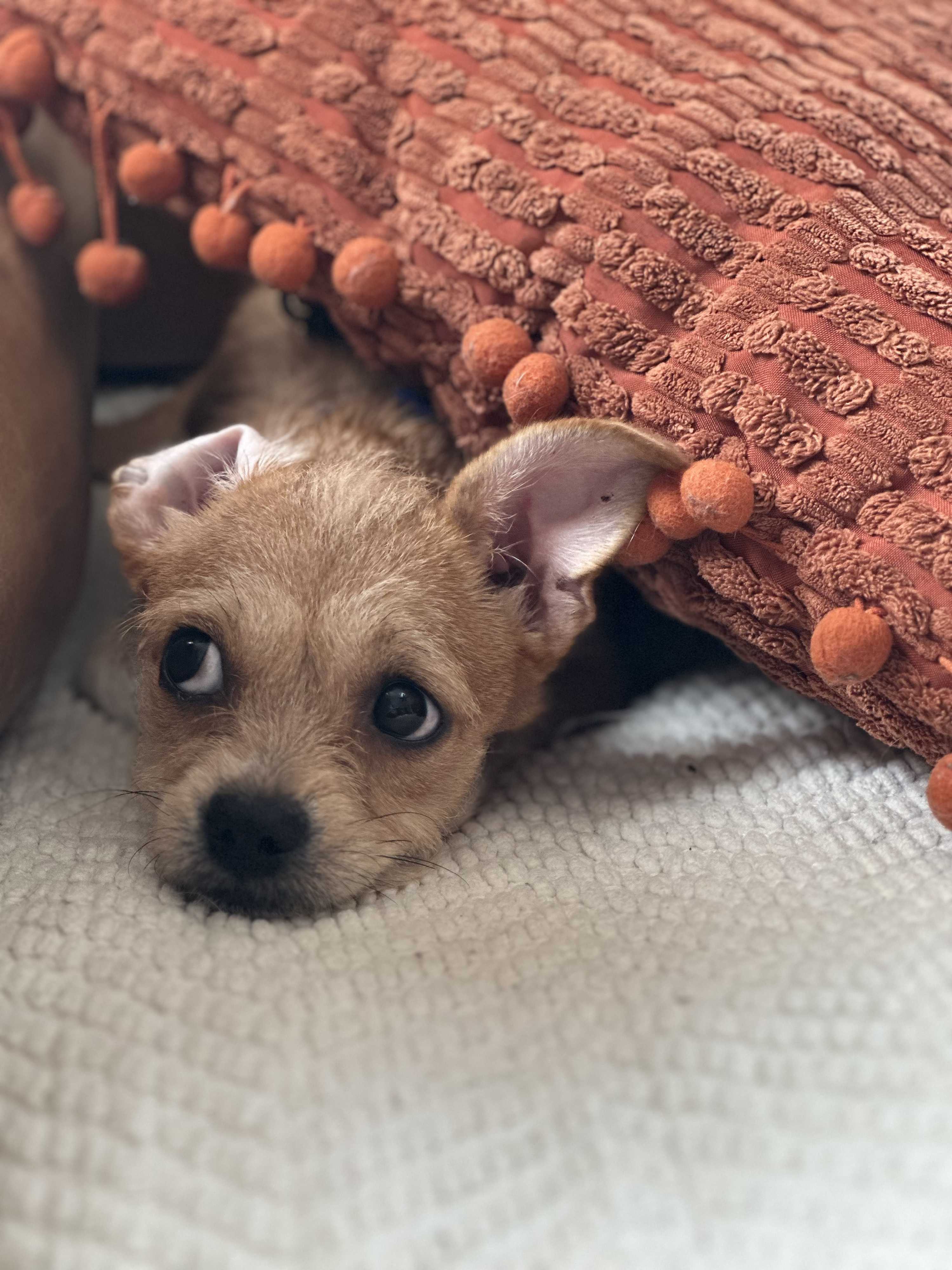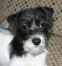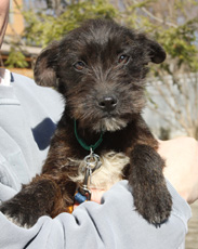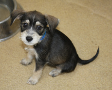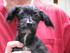 Puffin is about 8 weeks old and around 3 lbs. He is a typical puppy that loves to play and snuggle too. His mom looks like a wirehaired terrier/beagle mix and has the best personality.