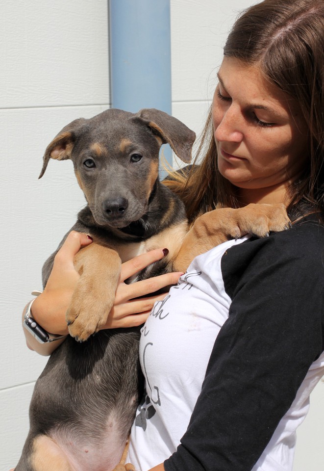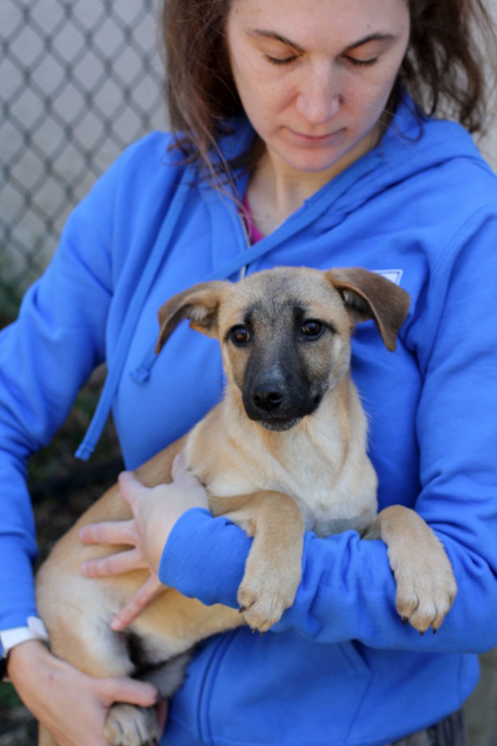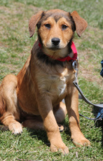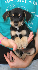 Priscilla is one of a litter of four active and loving puppies, about 4 1/2 months old. They are about 15 pounds now and may double their weight when fully grown. The mom looked just like Priscilla. We guess the dad looked more like the boys....black, brown and beige with adorable floppy ears. Each pup has their own personality from very outgoing to a bit shy but they all love to be in a lap and nuzzle their faces into a shoulder while giving a hug. They are paper trained and are getting very adept at walking on a leash. They love their toys and are extremely playful, entertaining their foster family with their antics. All four love the car and dog park. We have noticed that they love to jump on small children to give a lick so they probably should not go to a home with very young children. Like all of Pet Rescue dogs they are up to date on their vaccinations. You will love meeting Priscilla!(Foster: Paula) Thank you Wittney Rachlin for sponsoring my ticket to freedom!
