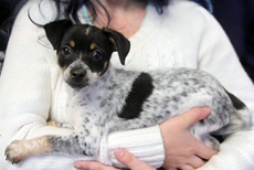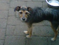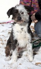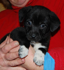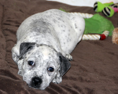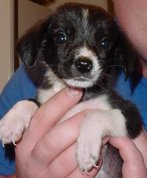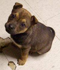 Panda (female) is one of Jenny's 8 adorable puppies, about 8-9 weeks old and around 5-6 lbs. Unlike their mom who looks like a Blue Heeler/Beagle mix (also posted), the pups have wirehaired fur, which may or may not shed as they mature. We do not know what breed the dad was. All we know is that they are sweet, playful and snuggly -- one being cuter than the next!