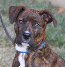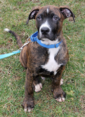 Pal is a 5 month old St. Bernard mix, about 25 lbs. He is a handsome puppy who loves his people and is always looking for attention. He is a little on the shy side but don't let his somber look fool you, he loves to play! He gets along great with cats and dogs, is crate trained and although he's not housebroken yet he has a good understanding that the bathroom is outside!