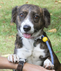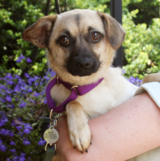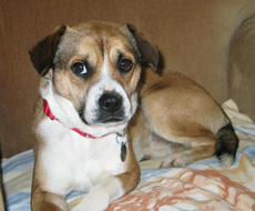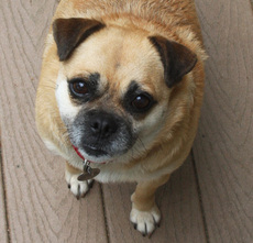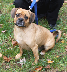 Paddy is a very happy 2 year old Pug/Beagle mix and weighs about 12 lbs. This little guy is so happy and friendly! He loves other dogs, is attempting to make friends with the cat in his foster home and loves kids. He will chase toys and curl up with you when he is done. He appears housebroken, sleeps through the night on his own dog bed and is enjoying the car rides. He enjoys walks and will even help you with his leash! He would make a great addition to a family with children who will enjoy his company. Paddy would love to find a home with a fenced in yard that he can run and play in. Click here to watch a video of Paddy.