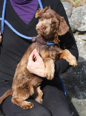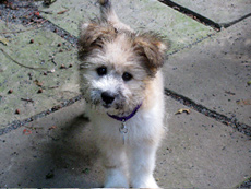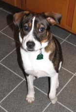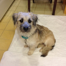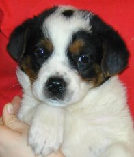 Paddington (male) is one of Jenny's 8 adorable puppies, about 8-9 weeks old and around 5-6 lbs. Unlike their mom who looks like a Blue Heeler/Beagle mix (also posted), the pups have wirehaired fur, which may or may not shed as they mature. We do not know what breed the dad was. All we know is that they are sweet, playful and snuggly -- one being cuter than the next!