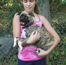 Pug was rescued in South Carolina by a "hard core" volunteer who took one look at her soulful eyes and saw a very sweet little girl needing a chance to blossom in a safe and loving home. She is still very cautious of people and takes time warming up to people. She spent her first few days in her new foster home cowering in the corner of a crate. She is now venturing out to see what her new world and foster home have to offer. She loves the other dogs snuggling with them and following them around the yard. Pug is a beautiful girl about one year old and up to date with her vaccinations. She is about 25 pounds.
