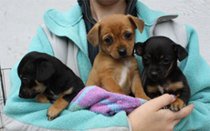 Queenie's puppies are too cute (mom is also posted). They each have their own sweet personality are playful and love piling on top of each other. We have two males: the red one and one black & tan pup. The female is black & tan and the smaller of the three. They've been with other dogs and cats in their foster home and love everyone. DOB: 09/06/09. Please no children under the age of 16 for these little ones.