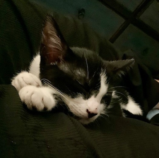 Rocky (Male, 8 weeks as of 7/19/19) - black and white with a black nose. He is a very funny little kitten. He waits for his foster mom at the door and jumps near her feet as soon as she comes in. He loves to play with paper / plastic bags, threads, any hanging cables etc. Although very cautious, Rocky is very curious and likes to explore every corner of the house. Rocky also loves to play with the foster mom's 6 year old daughter (dr)