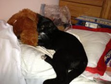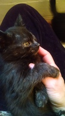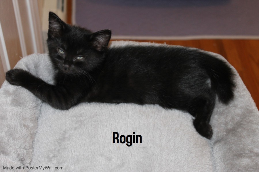 Rogin (female) is all black with a shortened tail that has a bump on the end. She's short of stature but big on personality! She's the first one up on her feet and always in the middle of the action. She's a climber, a clown and an expert at carrying HER toys away so that she doesn't have to share. She's a sweet, social girl that loves an audience.