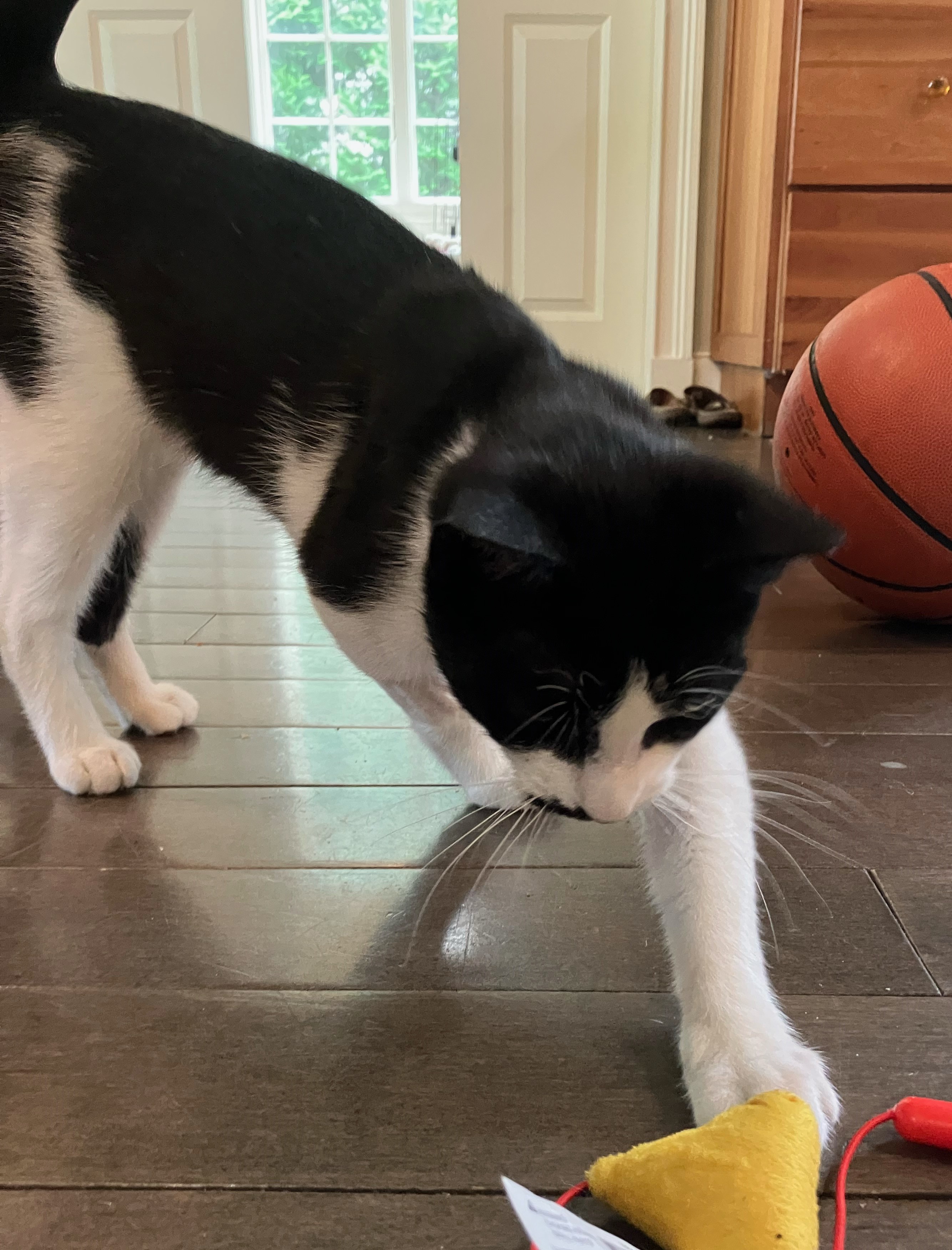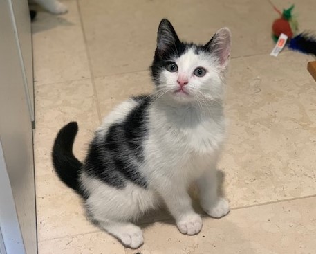 Born December 9, 2022 Reina is a soft spoken and intelligent black/white kitten who loves, loves and loves to play with toys. But this playful cat will also sit on the lap of her human friends and enjoys finding cozy, dark corners to take a snooze. Reina's foster home is without other pets (cats or dogs) but there are two children, ages 10 and 16 whose company she enjoys. Reina should do well in a family setting, as well as with a couple or single.