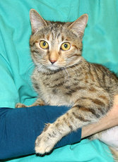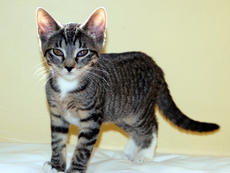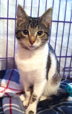 Rafi (a/k/a King or Jupiter) is a super sweet approx. 4-5 month old grey tabby kitten with a marvelous "rafish" personality. A bouncy, friendly kitty, he resides in a foster home where he gets along fine with the foster family dog, all the foster humans and is getting to know the adult male resident cat. Neutered and in excellent health, Rafi is a charmer! (ts)