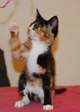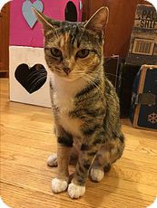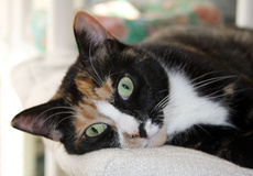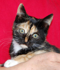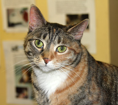Rayna is simply one of the most beautiful calicos you will lay eyes on. She is a stunner to look at, and seems to know this. There is a little bit of the "princess" in Rayna, but fundamentally she is an easygoing cat who enjoys being loved. Alert and intelligent, she gets along with other cats and would make a wonderful feline pet for a single adult or couple.