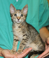is a gorgeous, playful 11 week-old kitten. He is one of a litter of three whose mother tested positive for feline HIV, which can be passed on to other cats but not to humans or dogs. He needs to be tested at 4 months to see if he has it. Our past experience with HIV kittens has been that follow-up tests were negative.