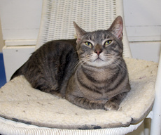 Ruthie is a cuddly love who likes lots of affection and shows her delight with loud purrs. This classically pretty tabby has many talents such as typing quickly (as long as you aren't fussy about spelling), preventing newspapers from escaping by sprawling across them and keeping your lap warm. Ruthie's sweet disposition enables her to make friends easily, including dogs and other cats. She was born around early May and resides in a foster home.