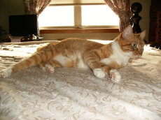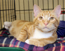 Ray is one handsome orange tabby kitty with white paws and chest. He loves getting attention and enjoys all the pets that come his way. With a strong, independent personality, Ray is one fun cat to have around. Unfortunately, he doesn't care for dogs, but will be a wonderful family cat in a non-canine household. To meet this special guy, please contact Kathy at kathydllf@msn.com.
