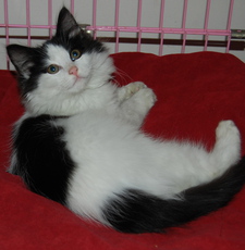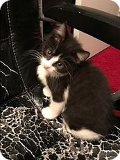 is an adorable tuxedo kitten. He is about seven weeks old. He loves to cuddle and play with people and his siblings. He purrs everytime he's held or pet. Reily would love to be adopted with one of his playmates! He also is used to children, other cats, and dogs. He will make a great family pet!