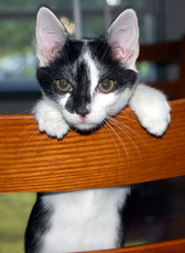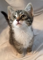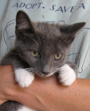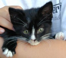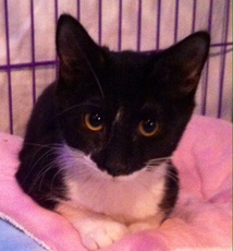 Rachel's Kittens are now only Prada. Prada's siblings (Bella, Storm and Jasper) were all adopted. Prada is approx. 12 weeks old and lives in a great foster home and gets lots of TLC from her foster family. Prada (a tuxedo w/white on her nose) is the mischievous one - very friendly and LOVES to be touched and cuddled. She's the one who starts the games and apparently she can do back flips. Please be advised that Prada must be adopted with either another young kitten or to a household with a young cat present.
