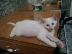 Runt is a beautiful 15 week old male kitten who loves to cuddle. Runt is deaf but responds to hand gestures and vibrations, such as pounding on the floor. He also responds to vocal vibrations when he is being held by someone. Because Runt cannot hear cars and other animals, he must be an indoor cat for safety reasons. He has also had his first set of shots and tested negative for FIV/FELV/HW Please contact Mary at kisskat44@yahoo.com