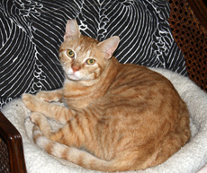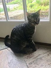 Ruby is the middle sister of Celeste & Alice (also posted). Ruby is a little more relaxed than Celeste. She is also playful but has a very endearing habit of tickling your feet when she's ready to be picked up. Ruby will come when called and is very lovable, always good for belly rubs which she rewards with a steady purr. Ruby is a mix of tabby stripes with patches of orange mixed in, called Torby.