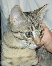 Rosie is a delightful, social, girl of 4-5 months (August 2018) needing a caring home. She's the prettiest tabby with big ears, a very long tail, and a quiet soft, quiet purr. When she gazes in your eyes you sense she sees deeply. On August 8 she was found on the street by a family who showered her with love, play time, and lots of car rides.