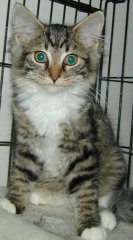 This sweet little girl was rescued from the streets with 3 of her litter mates. She is about 15-16 weeks old and really adorable She is already turning into a very affectionate girl. Her litter mates are black, black and white and another tabby and white (Robbie). All with the main coon look.