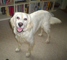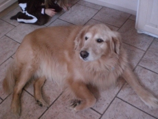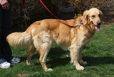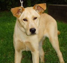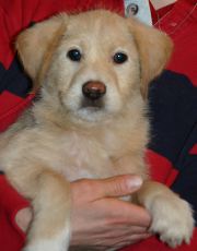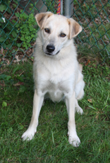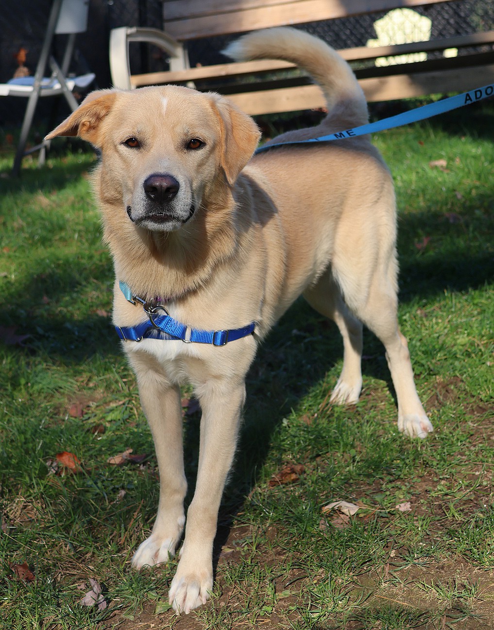 is a handsome male Labrador/Golden Retriever mix, approximately 2-3 years old. Very sweet and gentle. Approximately 45 lbs now but should weigh 55lbs. He is quite underweight and we are working on fattening him up. Needs foster or permanent home.
