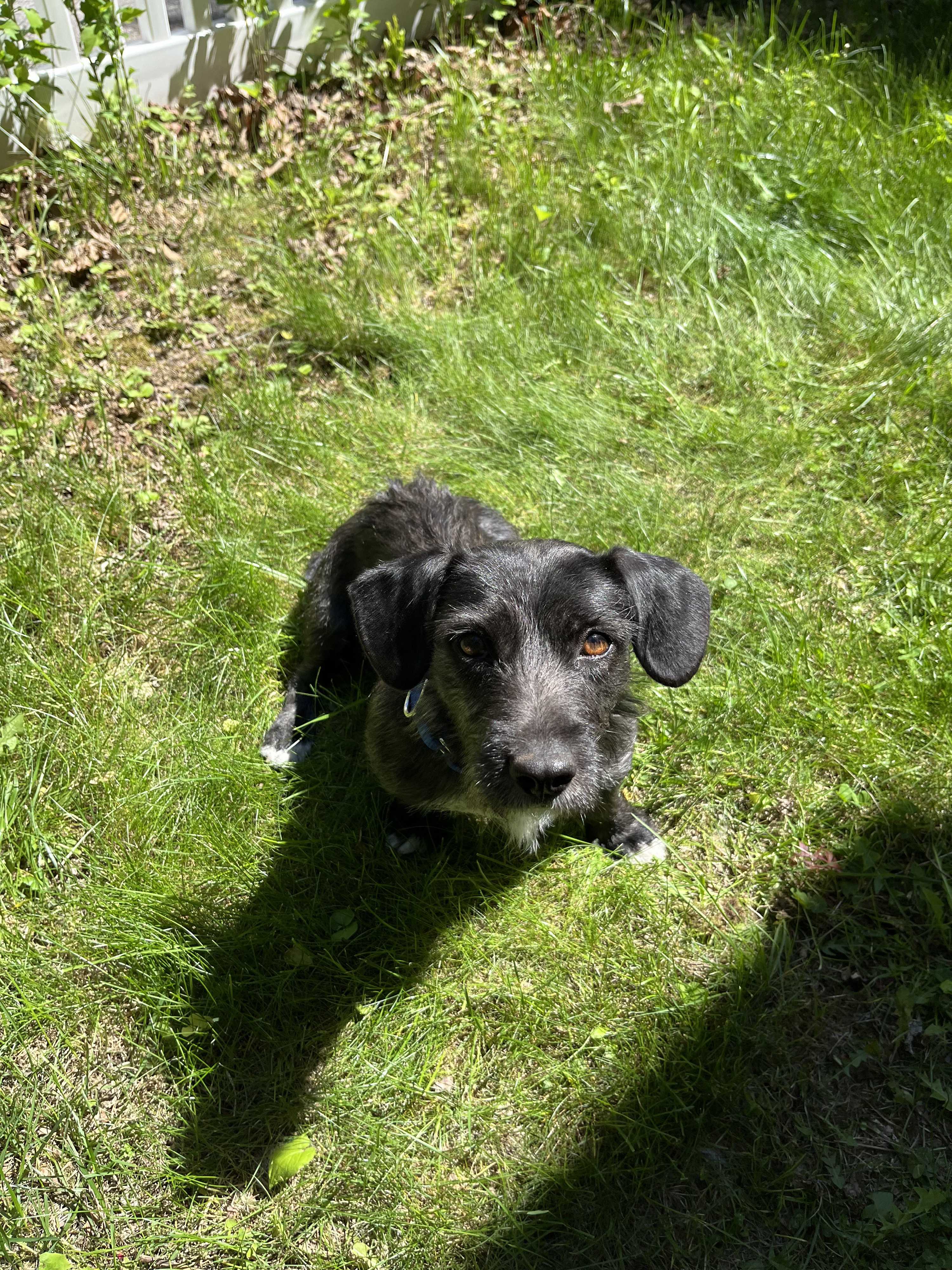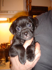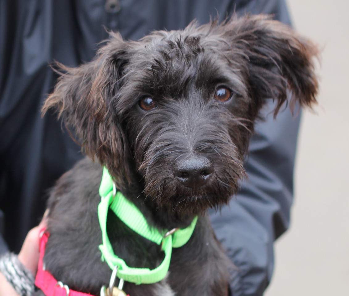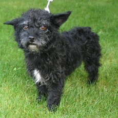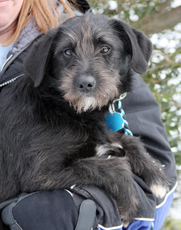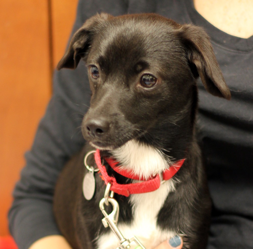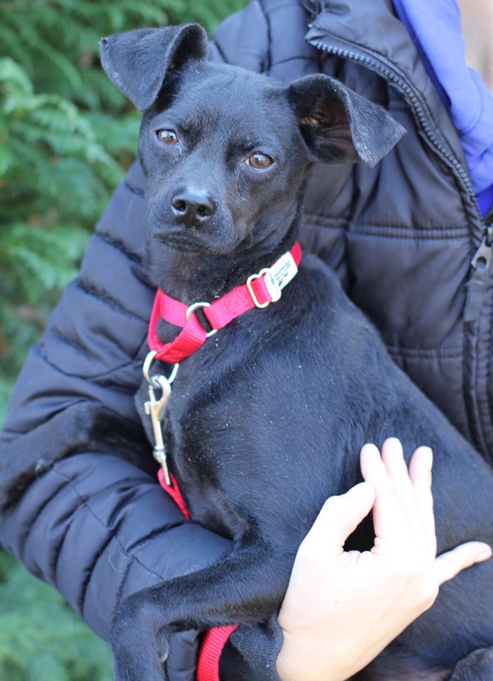 Ranco is an adorable 15-lb. Schnauzer mix with a silky black coat, a white chest and white feet. This 1-year-old boy is from the South so he is gradually learning to like frigid temperatures and snow. He is shy and gentle and would do well with a gentle dog to play with and show him the ropes. He loves belly rubs and treats and is quickly learning to sit for snacks. He likes his crate and often climbs in it for a nap. He is a gentle, quiet boy who is sweet, sweet, sweet!