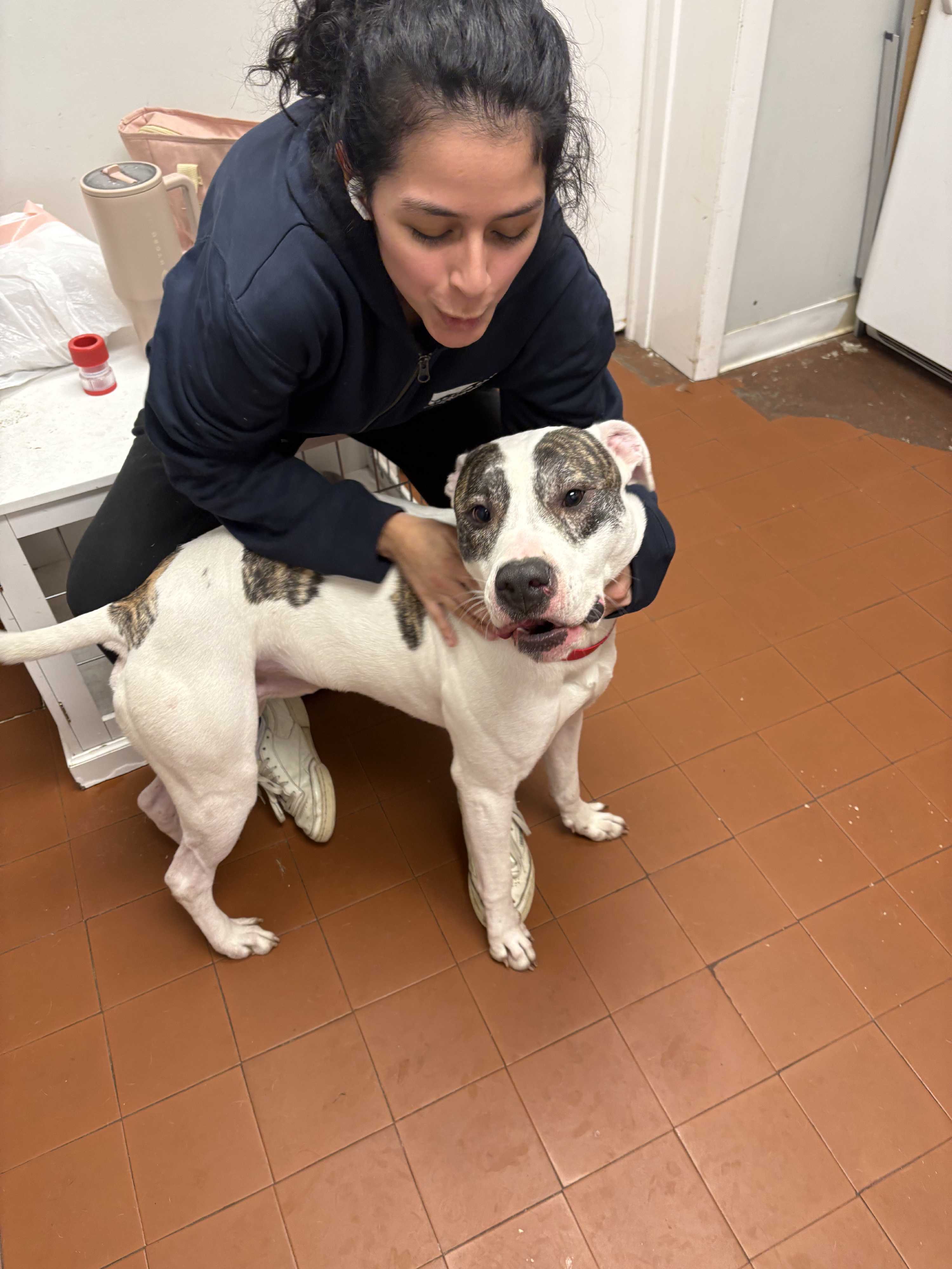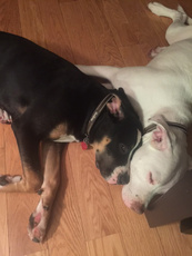 Hello all! My name is Ralph Kramden (white) and this is my brother Ed Norton (black). We are 7-8 month old Pit (50%), American Bulldog (40%) and Neapolitan Mastiff (10%) mixes. And YES, our mom did get a DNA test for us. When we were two months old, a wonderful lady rescued us from a man who was planning to use us as bait dogs in fighting rings. She was paying for us to be boarded in Manhattan until we could find a proper home that could take us together. You see, I'm deaf, and it was thought I would need to rely on my brother in our new home. Our new mom adopted us and quickly learned we are bonded through LOVE, but not through dependency. I am super smart and learn hand signals as quickly and easily as a hearing dog learns voice commands - sometimes I even learn faster than my brother! We learned a lot in our new home... we are completely house & crate trained, walk well on a leash and know basic commands. We are fantastic with other dogs, don't seem to mind cats, and friendly with everyone we meet. We are neutered and totally up to date on shots. Our mom also got us a complete health/blood panel and everything turned up great! So you are probably thinking... WHAT'S THE PROBLEM!? Well the issue is our mom has a big heart and was hoping us big dogs could manage in her small apartment - but she is being proven wrong! We are about 65 lbs each (and will grow about 5 more lbs). We are puppies and LOVE to play. The neighbors are complaining it sounds like a stampede and a dog kennel when we run! We sometimes bark when we are playing and the bottom line is, the condo board feels we are too much dog for too small a space. We would love a new home with a yard or more space indoors... and maybe someone that is home a little more. Although she got us dog walkers and we go to daycare or the dog park, being best friends means it's always time for having fun. Because of our size, we think we would do best in a home with children over 8 years old because we sometimes jump up when we are playing (but are working on it). Oh and we will come with everything we need to be happy puppies... crates, gates, beds, toys, treats, food, leashes, harnesses, bowls, tags... even a spray to make us smell pretty! All we need is a bigger space to let loose and for someone to love us. Can you be our new angel?