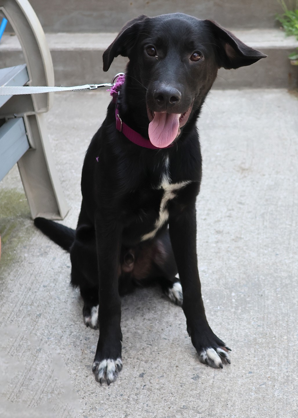 is a sweet, demure girl, about 1-2 years old and around 32 lbs. Those big brown eyes will melt your heart! Please fill out an adoption application.