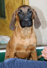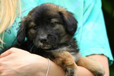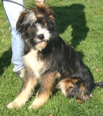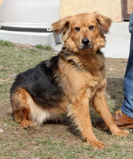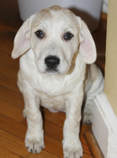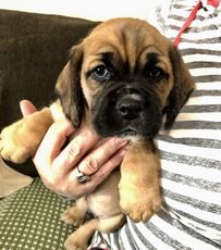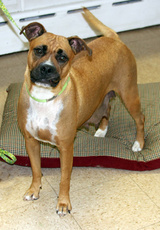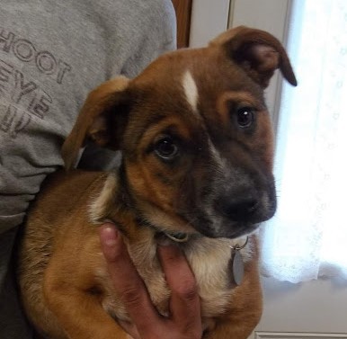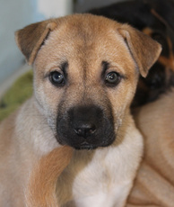 is an adorable, gentle young pup, about 4 1/2 months, who has just lost the only home he has ever known because of family illness. He is very upset and confused. He absolutely loves people but is frightened of other dogs since he was never exposed to them. His brother and sister are thriving in their own homes and are greatly loved; Rusty needs a home of his own where he can be fully cared for and loved too. He needs a gentle, quiet household to help him relax and know that he will not be abandoned again. It would help him also to have a calm, non-threatening dog brother or sister to teach him the joys of being a dog. He weighs 34 lbs and looks like a small Shepherd/Mastiff mix. His sister has a lot of wire hair, so we know there is some Wire-haired Terrier in him. He is short and stout. He is fully house broken and knows basic commands. He lived with a cat that he loved. He loves all people. Please fill out an adoption application.