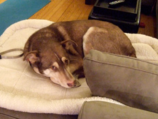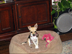 He is not a barker and sleeps all night on his bed without a sound. He likes to chew on his bone and to