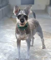 Raina is an adorable Schnauzer/Poodle mix, about 7-8 years old and around 24 lbs. She is so sweet and calm and follows you all around the house. She just wants to be cuddled and loved. She needs to lose a couple of lbs but we are working on that. She gets along with all the dogs in her foster home and loves all people -- although she would do best in a calm home without young children. Raina is housebroken and does not seem to shed. This is the sweetest little mush!